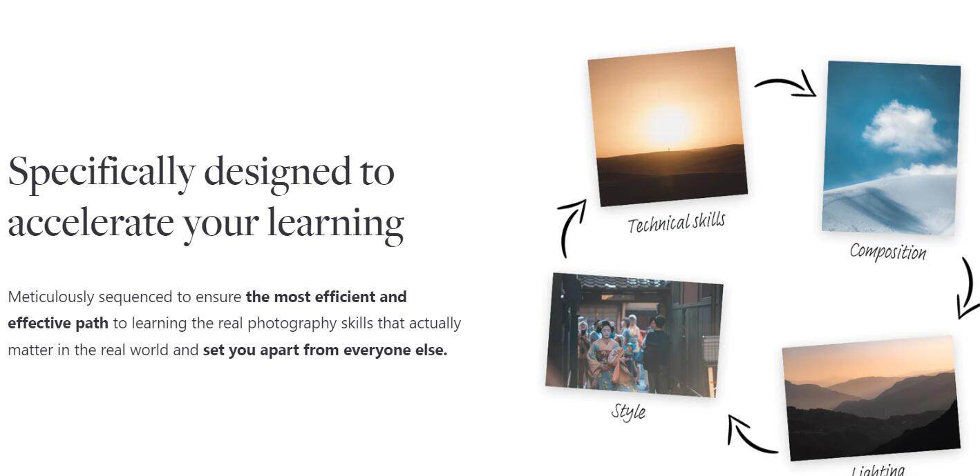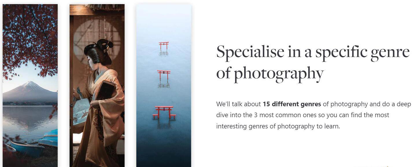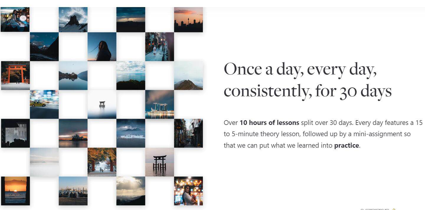 一起度过 30 天我们会学到什么在 10 小时的视频内容中,我们将逐步学习相互关联的主题。首先,我们将学习很多关于优秀摄影所需的技术技能;我称之为摄影的“工艺”。我们将讨论考虑曝光三角形的最佳方式,我们将讨论硬件;传感器、镜头。我们将讨论现代相机的焦点和所有物理特性。然后,除了我们还将讨论的弱光主题之外,我们还将进行一些关于光的对话,进行深入的光研究。有了关于摄影工艺的重要知识,我们将进入我所说的摄影“艺术”,我们将讨论构图、视觉语言和视觉层次,我们将讨论发展一种风格和发现你的艺术目的,并真正了解我们为什么要做我们所做的事情的内在价值观。从那里开始,考虑到艺术和工艺,我们将从整体的角度深入探讨和攻击摄影类型,以便我们能够对摄影作为一个整体如何运作有一个广阔的视野,我们将能够计划在未来几年内获得哪些技能。我们将简要讨论编辑,然后我们将以许多摄影辅助主题结束本课程,这些主题对于成为摄影师的体验非常重要。诸如位置搜寻和规划、备份和存储、分享我们的工作、创建业务等等。—课程内容第一天——到底什么是摄影?第 2 天— 传感器尺寸和摄像头第3天— 镜头第 4 天——接触、概述第 5 天— 曝光、快门速度第 6 天— 曝光、光圈第 7 天— 曝光,ISO第 8 天——关于专注第 9 天— 关于专注,第 2 部分第 10 天— 拍摄模式等第 11 天— 一切都与光有关第 12 天— 弱光第 13 天——到底什么是好的摄影?第 14 天——基本视觉模式第 15 天——主题,主题,主题第 16 天— 布局基础知识第 17 天— 找到你的风格第 18 天— 为你的艺术找到目标第 19 天— 摄影类型第 20 天— 风景:类型概述第 21 天— 街头摄影:类型概述第 22 天— 肖像画:类型概述第 23 天— 编辑基础知识第 24 天— Adobamp;#8203;amp;#8203;e Lightroom:编辑工作流程第 25 天— 辅助装备和必备品第 26 天— 地点勘察和规划第 27 天— 备份和存储第 28 天— 分享您的工作和社交媒体第 29 天— 以摄影为职业第 30 天— 下一步